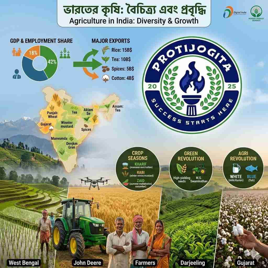 ১৯৬০-এর দশকে শুরু হওয়া সবুজ বিপ্লব ভারতের কৃষি ব্যবস্থায় আমূল পরিবর্তন আনে। উচ্চফলনশীল বীজ (HYV) এবং আধুনিক জলসেচ ব্যবস্থার ফলে খাদ্যশস্যের উৎপাদনে ভারত স্বনির্ভর হয়ে ওঠে। বর্তমানে সরকার ‘চিরহরিৎ বিপ্লব’ (Evergreen Revolution) এবং জৈব কৃষির (Organic Farming) ওপর বিশেষ জোর দিচ্ছে। পশ্চিমবঙ্গ সরকারের বিভিন্ন প্রতিযোগিতামূলক পরীক্ষার (WBCS, PSC) প্রস্তুতির জন্য ভারতের বিভিন্ন কৃষি অঞ্চল এবং উৎপাদনকারী রাজ্য সম্পর্কে সঠিক তথ্য রাখা একান্ত প্রয়োজন।