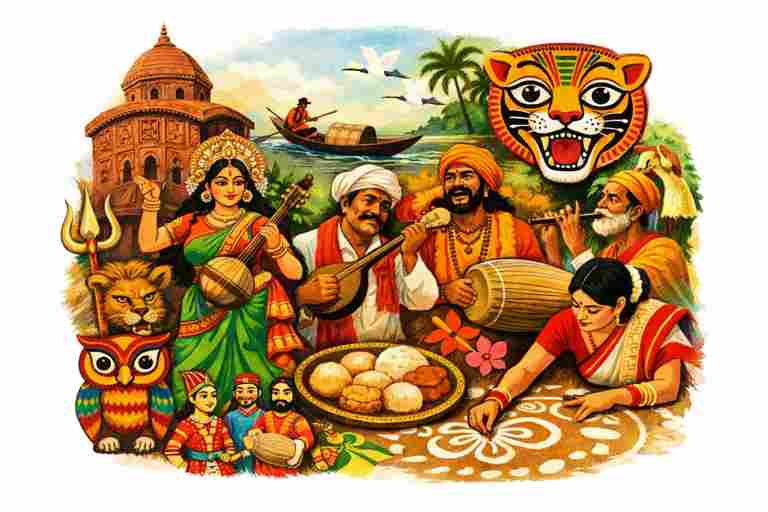 বাংলার উৎসব-অনুষ্ঠান, বিশেষত দুর্গাপূজা, কেবল ধর্মীয় আচার নয়—এটি শিল্প, স্থাপত্য, সংগীত ও সামাজিক মিলনের এক বৃহৎ ক্ষেত্র। প্রতিমা নির্মাণ, আলোকসজ্জা ও থিমভিত্তিক মণ্ডপ বাংলার সৃজনশীল শক্তির পরিচয় বহন করে। সাহিত্যক্ষেত্রে বাংলা ভাষা ও সাহিত্য বিশ্বসভায় বিশেষ মর্যাদা লাভ করেছে, যার অন্যতম প্রমাণ রবীন্দ্রনাথের নোবেল পুরস্কার।