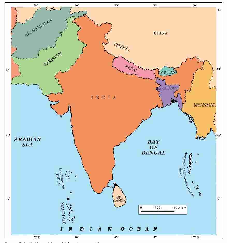 ভারতের উত্তর সীমানায় অবস্থিত China, Nepal ও Bhutan; পশ্চিমে Pakistan; পূর্বে Bangladesh ও Myanmar। এছাড়া সমুদ্রপথে ভারতের প্রতিবেশী দেশ হলো Sri Lanka ও Maldives।