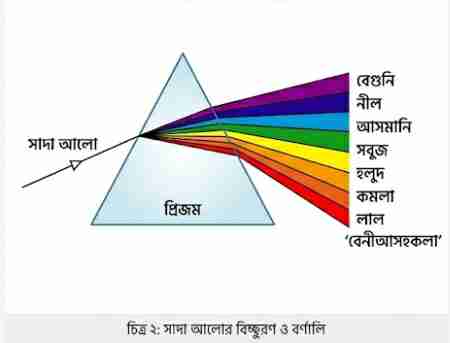 সাদা আলো যখন কোনো প্রিজমের মধ্য দিয়ে যায়, তখন তা সাতটি ভিন্ন রঙে (বেনীআসহকলা) বিভক্ত হয়ে যায়। একে আলোর বিচ্ছুরণ বলে। প্রকৃতিতে রংধনু সৃষ্টির পেছনেও এই একই কারণ কাজ করে।